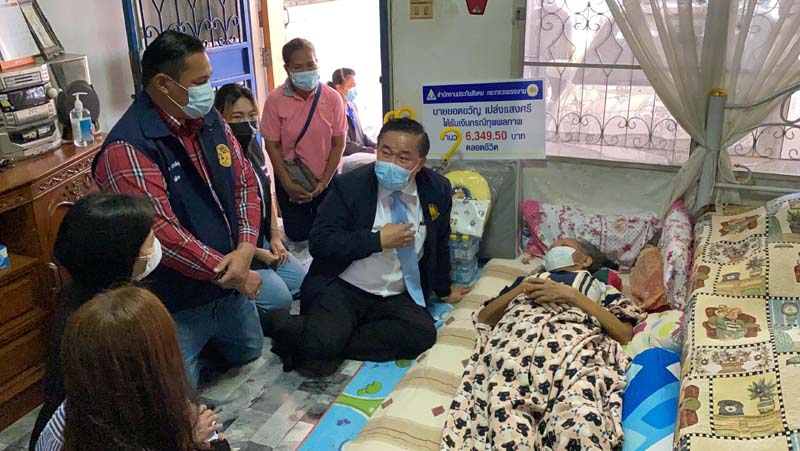 เมื่อเวลา 11.00 น.วันที่ 21 พ.ค.2564 ดร.จำลอง ช่วยรอด คณะที่ปรึกษารัฐมนตรีว่าการกระทรวงแรงงาน นางวันทนา ณัฐพูลวัฒน์ ผู้ตรวจราชการกรม สำนักงานประกันสังคม นายธีระ โรจนประดิษฐ์ ปลัดอำเภอไทรน้อย นางอัจจิมา ธาราแสวง นักวิชาการแรงงานชำนาญการพิเศษ สำนักงานประกันสังคมจังหวัดนนทบุรี เดินทางไปที่บ้านเลขที่ 7/1458 หมู่9 ต.ไทรน้อย อ.ไทรน้อย จ.นนทบุรี เพื่อมอบเงินช่วยเหลือให้กับนายยอดขวัญ เปล่งแสงศรี อายุ 55 ปี อดีตเซลขายยาและเป็นผู้ป่วยติดเตียง ซึ่งหลังได้รับเรื่องร้องทุกข์จากภรรยาว่าสามีป่วยเป็นอัมพาตต้องนอนติดเตียงไม่สามารถประกอบอาชีพได้ ส่วนตนก็มีรายได้จากการรับจ้างเย็บผ้าได้วันละ 100 กว่าบาท ไม่พอสำหรับค่ายาพาสามีไปรักษาตามที่หมอนัดลำพังค่าใช้จ่ายกินอยู่ต่อวันก็ไม่พอได้รับความเดือนร้อนอย่างมาก หลังรับเรื่องได้ลงพื้นที่ไปตรวจสอบก็พบว่าสามีเคยเป็นพนักงานขายยาให้กับบริษัทเอกชนแห่งหนึ่งและมีสิทธิอยู่ในระบบประกันสังคมแต่ว่าทั้ง 2 คนไม่ทราบว่าตนเองมีสิทธิ์ในการได้รับความช่วยเหลือจากประกันสังคม