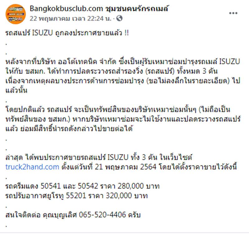 วันที่ 24 พฤษภาคม 2564 โลกออนไลน์ได้มีกาแชร์เพจเฟซบุ๊ก Bangkokbusclub.com ชุมชนคนรักรถเมล์ ออกมาเผยข้อมูลว่า รถเมล์สแปร์ ยี่ห้อ ISUZU ถูกลงประกาศขายแล้ว !! รวม 3 คัน ในเว็บไซต์ truck2hand.com ตั้งแต่วันที่ 21 พฤษภาคม 2564