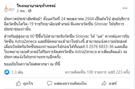 สำหรับผู้สูงอายุ 60 ปีขึ้นไปสามารถรับวัคซีน Sinovac ได้ “แต่” หากต้องการรับวัคซีน AstraZeneca และมีนัดหมายเข้ามาในช่วงนี้ สามารถแจ้งความประสงค์เลื่อนวันนัดรับวัคซีนของท่านออกไปก่อนได้ที่เบอร์ 0 2576 6833-36 และเมื่อโรงพยาบาลจุฬาภรณ์ได้รับการจัดสรรวัคซีน AstraZeneca มาเพิ่มเติมแล้ว จะประกาศแจ้งให้ทุกท่านทราบอีกครั้ง ขออภัยในความไม่สะดวกมา ณ ที่นี้”