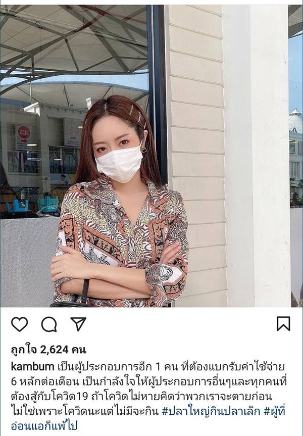 โดยสาวแก้มบุ๋ม โอดผ่านอินสตาแกรม มีข้อความว่า “เป็นผู้ประกอบการอีก 1 คน ที่ต้องแบกรับค่าใช้จ่าย 6 หลักต่อเดือน เป็นกำลังใจให้ผู้ประกอบการอื่นๆและทุกคนที่ต้องสู้กับโควิด19 ถ้าโควิดไม่หายคิดว่าพวกเราจะตายก่อน ไม่ใช่เพราะโควิดนะแต่ไม่มีจะกิน #ปลาใหญ่กินปลาเล็ก #ผู้ที่อ่อนแอก็แพ้ไป”