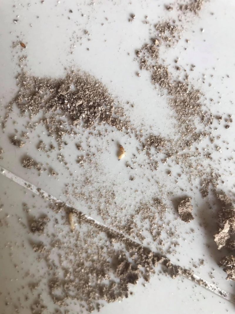 -8 พค 64 วันพีคของจริง แม่กวาดบ้าน บันไดชั้นแรก เจอดินเกาะขอบข้างบันไดทั้ง2ฝั่ง ลูบดูมีทั้งรอยกินใต้บันได มีตัวปลวกออกมายั้วเยี้ย แม่บอกนี้ปลวกแน่นอน เลยตามบริษัทปลวกที่เพิ่งฉีดเมื่อเดือนกว่าๆแบบจัดเต็ม มาฉีดอัดอีกรอบ รื้อห้องใต้บันได เจอปลวกเป็นทางยาว ปลวกเยอะมาก ออกมาจากพื้น