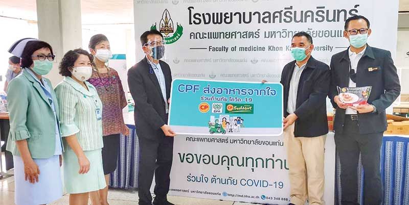 รศ.นพ.ทรงศักดิ์ เกียรติชูสกุล ผู้อำนวยการโรงพยาบาลศรีนครินทร์ คณะแพทยศาสตร์ มหาวิทยาลัยขอนแก่น พร้อมด้วย ผศ.ดร.วันชนะ สืบไวย ผู้ช่วยคณบดีฝ่ายศูนย์ความเป็นเลิศและศูนย์กลางบริการสุขภาพ คณะแพทยศาสตร์ ม.ขอนแก่น รับมอบอาหารพร้อมทานจากบริษัท เจริญโภคภัณฑ์อาหาร จำกัด (มหาชน) หรือซีพีเอฟในโครงการ “CPF ส่งอาหารจากใจ ร่วมต้านภัยโควิด-19” ตามนโยบายเครือเจริญโภคภัณฑ์ ภายใต้โครงการ “ซีพีร้อยเรียงใจ สู้ภัยโควิด-19” ที่บริษัทเดินหน้าส่งมอบให้กับโรงพยาบาลและหน่วยงานต่างๆอย่างต่อเนื่อง เพื่อร่วมเป็นส่วนหนึ่งในการลดภาระการจัดเตรียมอาหารให้กับทีมแพทย์ พยาบาล บุคลากรทางการแพทย์ และเจ้าหน้าที่ เป็นการส่งมอบกำลังใจแก่บุคลากรที่ปฏิบัติหน้าที่ดูแลคนไทยทุกคนที่อย่างเต็มกำลัง โดยมี ยุทธชัยคงสมมาตร ผู้แทนซีพีเอฟ พร้อมชาวซีพีเอฟจิตอาสาจากธุรกิจสุกร จ.ขอนแก่น ร่วมส่งมอบ