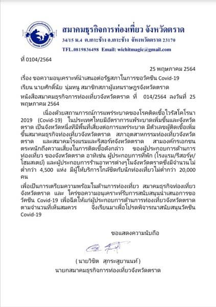 จากนั้นตัวแทนผู้ประกอบการท่องเที่ยว จ.ตราด คือ นายวิชิต สุกระสุยานนท์ นายพรชัย เขมะพรรคพงษ์ ได้ยื่นหนังสือให้นายศักดินัย ผลักดันขอความอนุเคราะห์สนับสนุนวัคซีนป้องกันโรคติดเชื้อไวรัสโควิดจากรัฐบาล เพื่อมาฉีดให้ผู้ประกอบการท่องเที่ยวจ.ตราดโดยเร็ว และยังได้ยื่นให้กับผู้ว่าราชการจังหวัดตตราด และรัฐมนตรีว่าการกระทรวงการท่องเที่ยวและกีฬาด้วย
