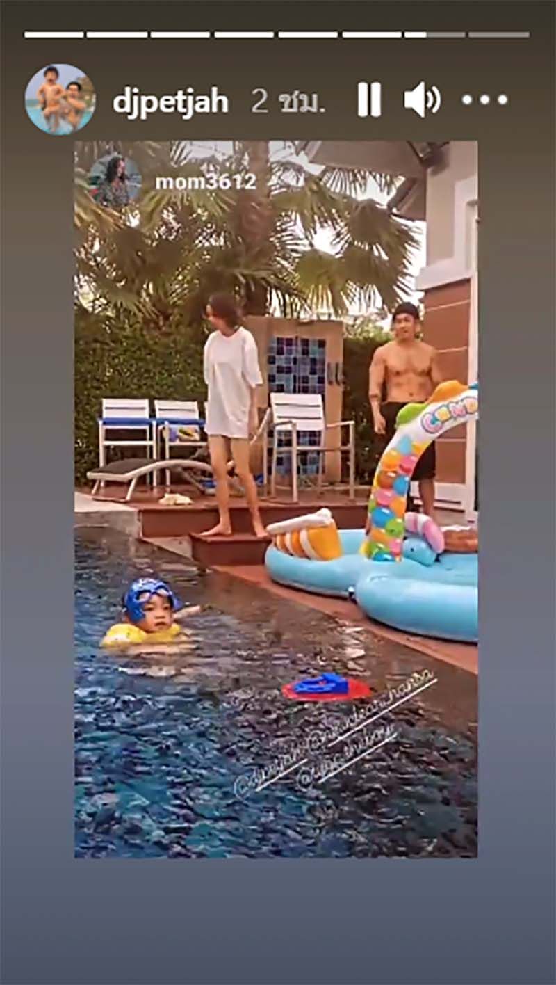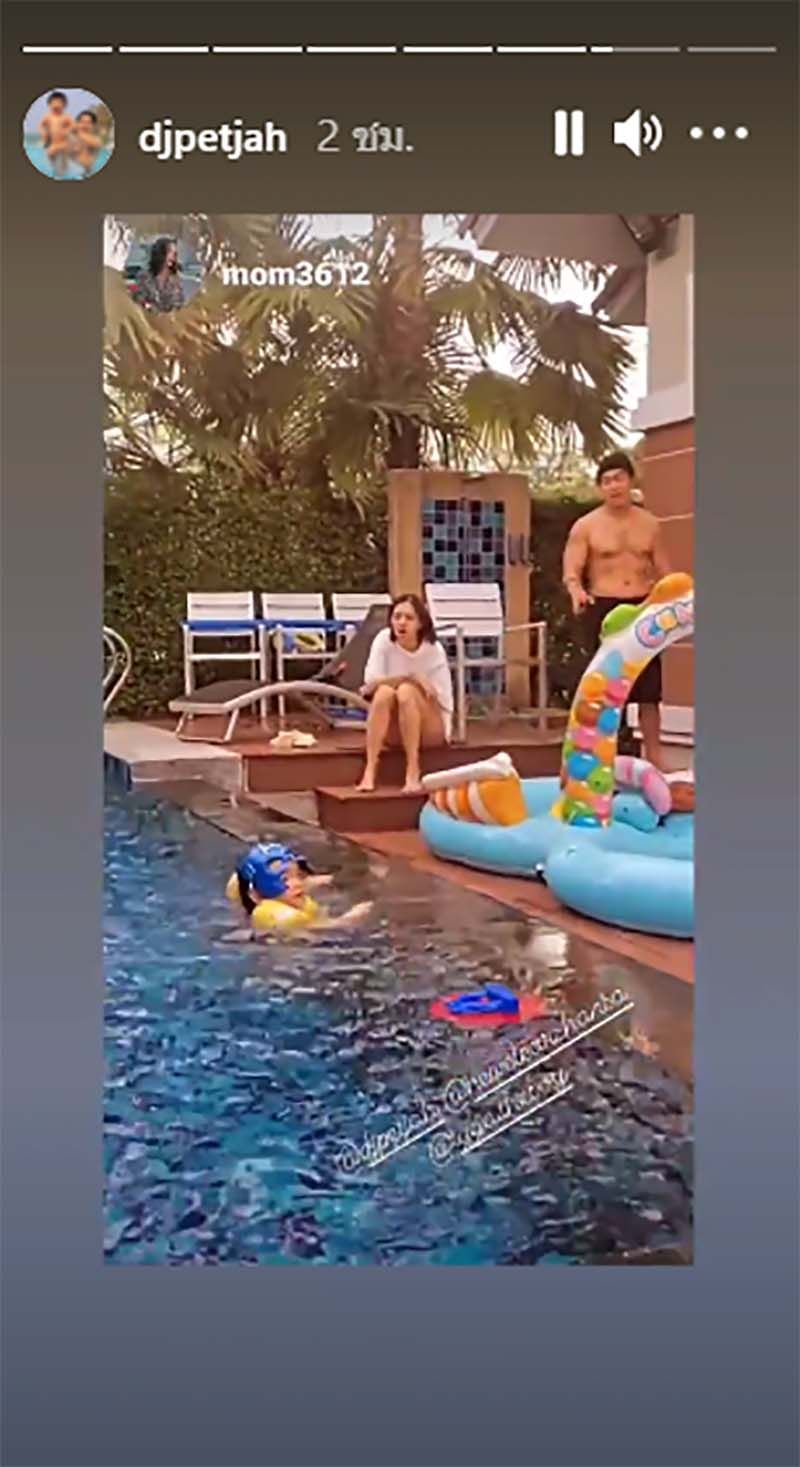 ล่าสุด สยบข่าวรักร้าว ด้วยการที่ ดีเจเพชรจ้า ได้แชร์สตอรี่ขณะที่ตนและครอบครัวอยู่ริมสระน้ำ แถมยังดูแฮปปี้สุดๆ ซึ่งแน่นอนว่ามีภรรยาสาวคนสวยร่วมเฟรมด้วย