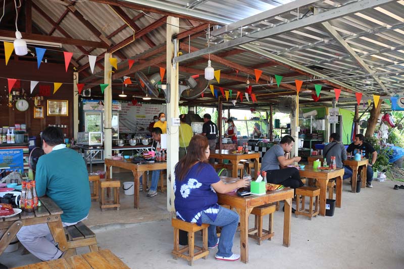 นางสาวเนาวรัตน์ฯ บอกต่ออีกว่าเปิดร้านมาตั้งแต่ช่วยเดือนธันวาคม 2563 เวลาประมาณ 5 เดือน แรกๆ ยังไม่เป็นที่รู้จัก ตนขาดทุนทุกวัน พอได้สัก 1 เดือนผ่านไป เริ่มมีการบอกต่อปากต่อปากลูกค้าเพิ่มมากขึ้น ตนก็พอได้กำไร ตนตอนนี้ผ่านไป 5 เดือน ผลตอบรับดีมาก ลูกค้าแวะเวียนมาตลอดทั้งวันโดยเฉพาะช่วงกลางวัน คนจะเยอะมาก แต่ตนก็พยายามจัดสถานที่แบบ New normal เว้นระห่าง และก็มีทั้งทานที่ร้านหรือสั่งกลับบ้านก็ได้ เมนูอาหารของทานร้านมีกว่า 100 เมนู แต่จะผลัดเปลี่ยนหมุนเวียนทำวันละ 15 เมนู อาทิเมนูเด็ดๆ คือ คั่วกลิ้งหมู นกกระทาผัดเผ็ดหน่อไม้ ยำหอยดอง แกงเปรอะผักหวาน น้ำพริกกระปิ-ไข่ต้ม ผักสลัดสด เป็นต้นสำหรับอาหาร และเมนูขนมจีน น้ำยา แกงเขียวหวาน จะยืนพื้นมีทุกวัน และมีเมนูเมี่ยงปลาเผา ในราคาชุดละ 99 บาทไว้บริการด้วย โดย 1 ชุด จะมีปลานิลไซส์ 8 ขีด เผา 1 ตัว ผัก น้ำจิ้มซีฟู้ด น้ำจิ้มเมี่ยงปลา และขนมจีน ซึ่งนับว่าเป็นราคาที่คุ้มมากสำหรับลูกค้าไว้บริการด้วย