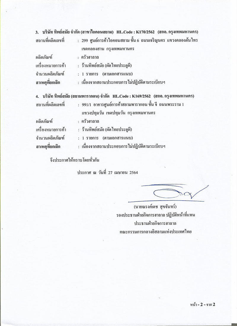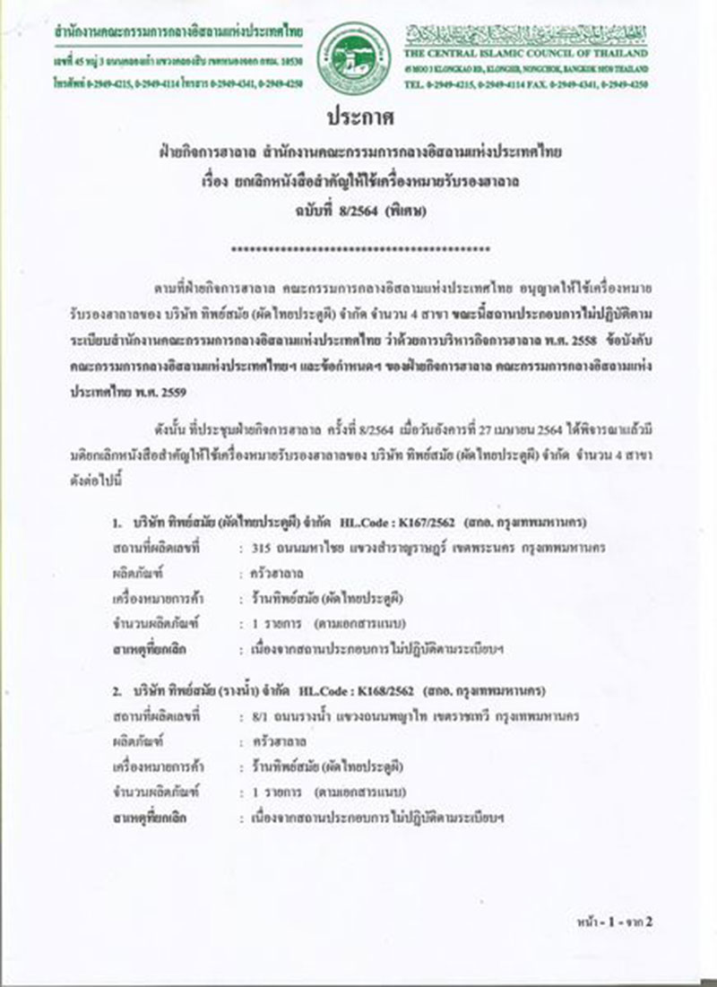 วันที่ 28 พฤษภาคม 2564 เพจเฟซบุ๊ก สำนักงานคณะกรรมการกลางอิสลามแห่งประเทศไทย ได้โพสต์ข้อความระบุว่า “ฝ่ายกิจการฮาลาล คณะกรรมการกลางอิสลามแห่งประเทศไทย มีมติยกเลิกให้ใช้เครื่องหมายรับรองฮาลาล ของ บริษัท ทิพย์สมัย (ผัดไทยประตูผี) จำกัด ทุกสาขา เนื่องจากไม่ปฏิบัติตามระเบียบคณะกรรมการกลางอิสลามแห่งประเทศไทย ว่าด้วยการบริหารกิจการฮาลาล พ.ศ. 2558 ในกรณีธุรกิจสาขาต้องขอรับรองฮาลาลทุกสาขา #ยกเลิกเครื่องหมายฮาลาล #ฮาลาลประเทศไทย”