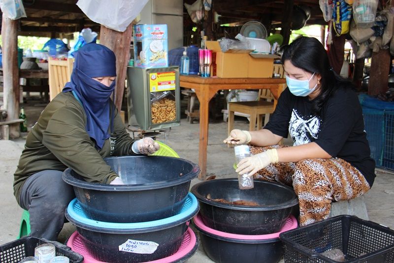 แต่ช่วงการแพร่ระบาดโควิด 19 ระบาดระลอกที่ 3 ซึ่งถือว่าหนักมาก ทำให้ครอบครัวได้รับผลกระทบ มีสั่งซื้อลูกปลาน้อยลง จึงต้องปรับเปลี่ยนหาอาชีพเสริมใหม่มาเลี้ยงด้วงสาคูได้ประมาณ 3 เดือนเศษ โดยมีเพื่อนสมาชิกในกลุ่มประมาณเกือบ 600 คน หันมาเลี้ยงด้วงส่งขายตามตลาดนัดนำไปทอดกรอบร่วมกับแมลงอื่น ๆ เลี้ยงง่ายโตเร็ว ใช้เวลาเพียงเดือนเศษ ก็สามารถจับขายส่งจำหน่ายตลาดได้แล้ว ซึ่งที่นี่ยังถือเป็นการรวมกลุ่มเลี้ยงด้วยสาคูในช่วงสถานการณ์โควิดที่ทำให้ชาวบ้านมีรายได้เลี้ยงครอบครัวใช้เวลาไม่นาน อีกทั้งที่กลุ่มเลี้ยงด้วงสาคูยังมีเทคนิคการเลี้ยงที่แปลกโดยนำเปลือกทุเรียนที่ไม่มีค่าถูกทิ้ง หลังจากที่แม่ค้าขายเนื้อทุเรียนไปแล้ว นำมาใส่ในกะละมัง ร่วมกับวัสดุอื่นๆ เพื่อด้วงกินเปลือกทุเรียนสามารถลดต้นทุนการเลี้ยงได้เยอะมาก