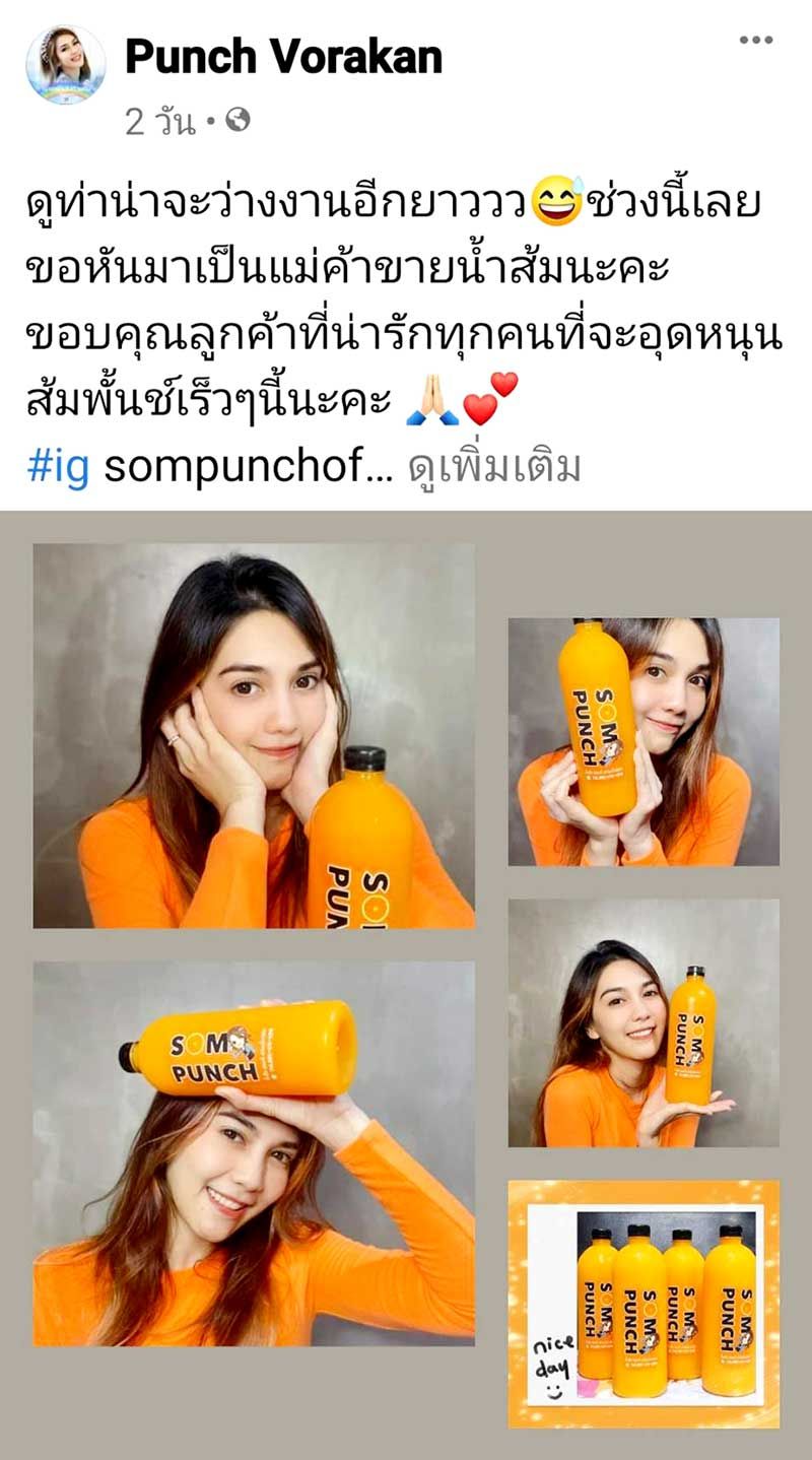 โดย “สาวพั้นซ์” ประกาศให้โลกรู้ว่าขายน้ำส้มจ้า!! “ดูท่าน่าจะว่างงานอีกยาววว…ช่วงนี้เลยขอหันมาเป็นแม่ค้าขายน้ำส้มนะคะน้ำส้มแท้สายน้ำผึ้ง+โชกุนสกัดเย็นผสมเนื้อส้มแท้ 100 เปอร์เซ็นต์นะคะขอบคุณลูกค้าที่น่ารักทุกคนที่จะอุดหนุนส้มพั้นช์นะคะ” ต้องบอกว่าขยันจริงๆ สามารถพลิกวิกฤติให้เป็นโอกาส แถมลุยขายเองด้วย เอ้า!!ขายดิบขายดีอย่าลืมแบ่งเวลามาร้องเพลงให้แฟนๆ ได้หายคิดถึงกันด้วยนะจ๊ะ งานนี้แฟนคลับสาวตาแดงๆตามไปอุดหนุนกันได้ที่ sompun.official หรือไลน์ @wmw6187j หรือไลน์ที่เบอร์ 092-6146916 หรือถ้าอยากสดชื่นตอนเช้าๆ ก็สั่งได้ที่เบอร์ 086-8955841 ขายทั้งปลีกและส่งกันไปเลยจ้า!!
