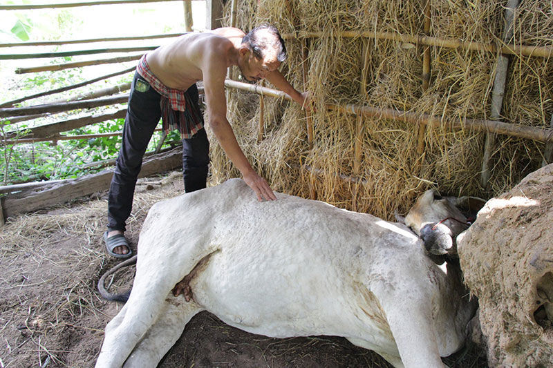 โดยฉีดเฉลี่ยวันละ 2 เข็มติดต่อกัน 3 วัน รวมเป็น 6 เข็ม พอตื่นมาตอนประมาณตี 5 เมื่อเช้า เดินไปดูพบว่าวัวนอนตายทั้งกลมอยู่ภายในคอกแล้ว ซึ่งตนก็ไม่รู้ว่าสาเหตุที่วัวตายทั้งกลม เพราะโรคระบาดหรือเพราะฤทธิ์ของยาที่ฉีดเข้าไป แต่ก็ไม่ได้ติดใจจะเอาเรื่องกับคนที่มาฉีดยาให้ แต่เสียใจที่ต้องสูญเสียวัวพร้อมลูกในท้อง ซึ่งก่อนหน้านี้เคยมีคนมาขอซื้อตัวแม่ในราคา 3 หมื่น 5 พันบาท แต่ตนไม่ขายเพราะตั้งใจจะเลี้ยงไว้ขยายพันธุ์ สำหรับซากวัวที่ตายทั้งกลมตนก็จะฝังกลบไม่กล้านำไปบริโภค