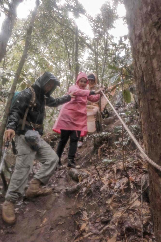 ชวนเที่ยวทิพย์กันต่อกับการพิชิตยอดดอยทูเล เดินเท้าเข้าป่ากันต่อ ระหว่างทางมีปีนป่ายแหวกกิ่งก้านไม้ไต่เชือกท่ามกลางสายฝน โดยปลายทางอยู่ที่จุดตั้งแคมป์ดอยทูเล…ซึ่งใช้เวลาเดินทาง 4 ชั่วโมง ตลอดการเดินทางเรียกว่าตัวเปียกเป็นลูกนกตกน้ำ ส่วนเส้นทางเดินที่สูงชันไม่ต้องพูดถึงมีลื่น ไถล แถกันตลอด เรียกว่าทุลักทุเลสมกันสุดๆแต่ก็สนุกกันสุดๆ เหมือนกัน
