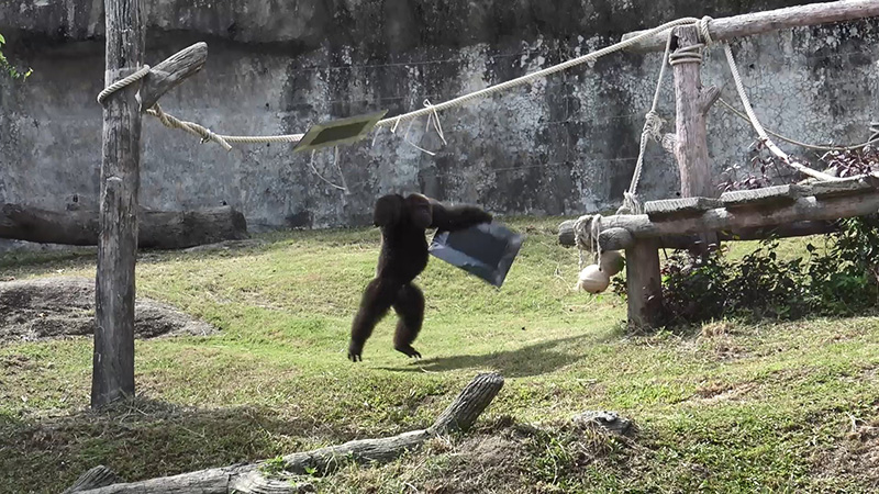 จากนั้นเจ้าหน้าที่ได้โยนลูกฟุตบอลลงไปให้เจ้าจ้อนเล่น เพราะเจ้าจ้อนชอบเล่นฟุตบอล เมื่อได้รับฟุตบอลแล้ว เจ้าจ้อนก็วิ่งไปคว้าลูกฟุตบอลวิ่งลงมาเพื่อโยนให้ลูกฟุตบอลให้เจ้าหน้าที่รับบ้าง แต่วันนี้มันโยนแรงไปหน่อยลูกฟุตบอลลอยสูงข้ามหัวไปตกในคอกลิงอุรังอุตัง เมื่อมันวิ่งเล่นจนเหนื่อยก็พักครึ่งให้น้ำตามกติกาเจ้าหน้าที่โยนน้ำแดงแช่เย็นของโปรดเจ้าจ้อน มันกินอย่างเอร็ดอร่อยตามลีลาของเจ้าจ้อยที่เห็นเป็นประจำ
