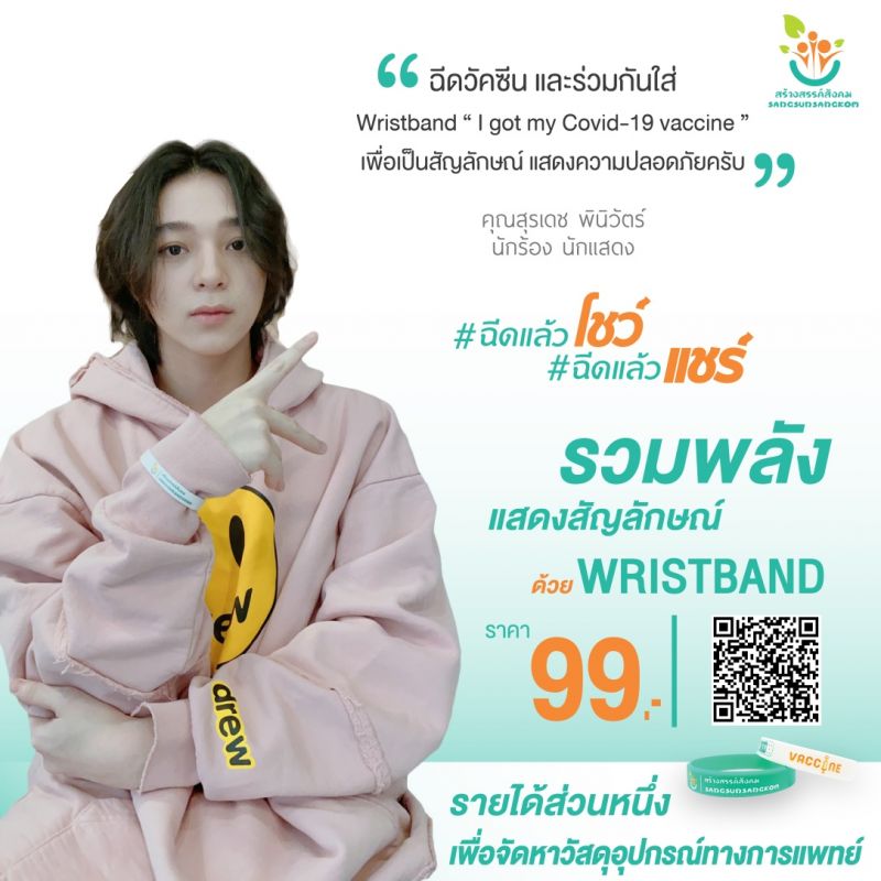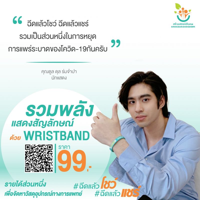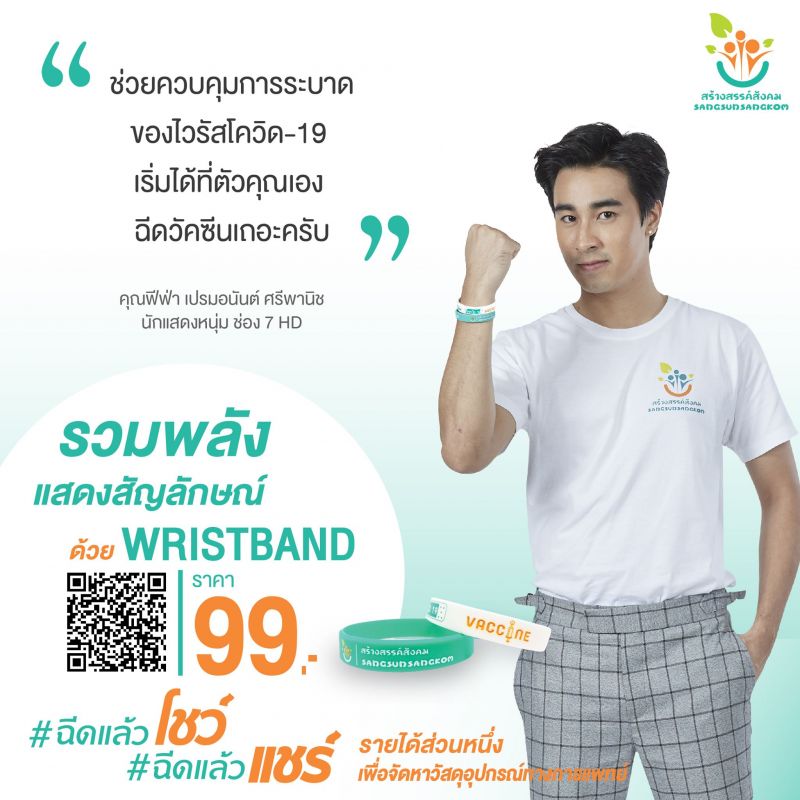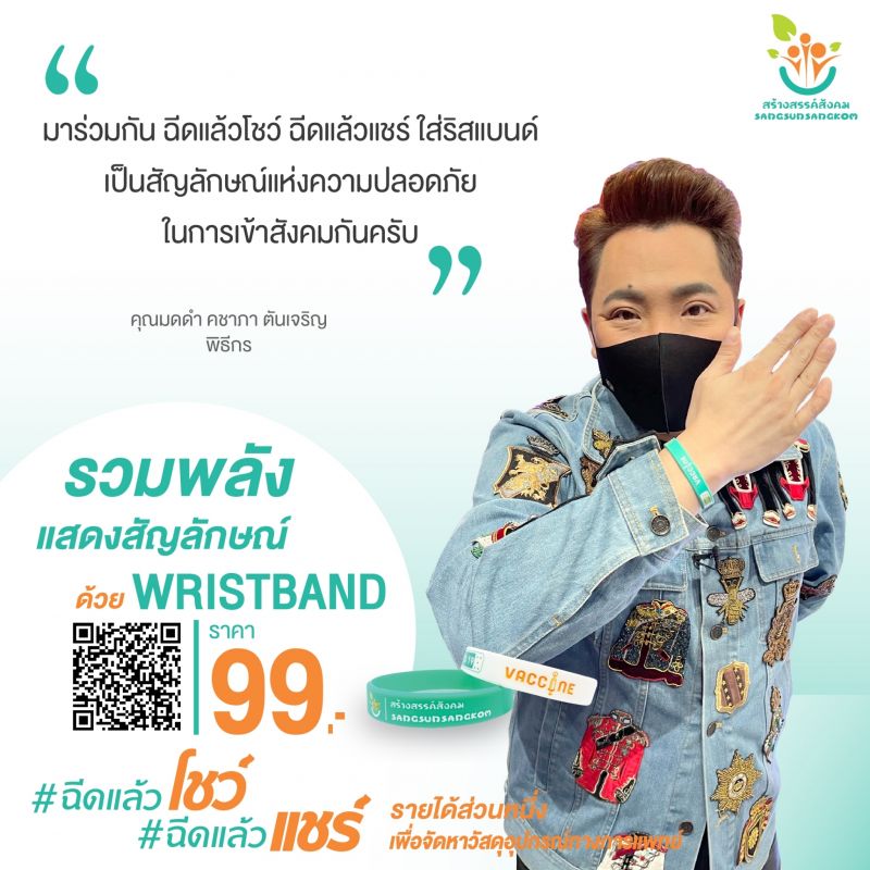 เชิญชวนผู้ที่ฉีดวัคซีนต้านไวรัสโควิด 19 ครบ 2 เข็มแล้ว ร่วมกันสนับสนุนสวมใส่ “ริสแบนด์ i got my covid19 vaccine” กับโครงการ สร้างสรรค์สังคม ในแคมเปญ“ฉีดแล้วโชว์ ฉีดแล้วแชร์” ในราคาเส้นละ 99 บาท เพื่อเป็นสัญลักษณ์แห่งความปลอดภัย และการอยู่ร่วมกันในสังคมอย่างมั่นใจ ว่าคุณเป็นผู้ที่ได้รับการฉีดวัคซีนป้องกันไวรัสโควิด 19 เป็นที่เรียบร้อยแล้วโดยรายได้ในการจัดจำหน่าย ทางโครงการสร้างสรรค์สังคม จะนำไปซื้ออุปกรณ์ทางการแพทย์ และส่งมอบไปยัง โรงพยาบาล หน่วยงานต่างๆ ในที่พื้นที่ ที่ขาดแคลนต่อไป