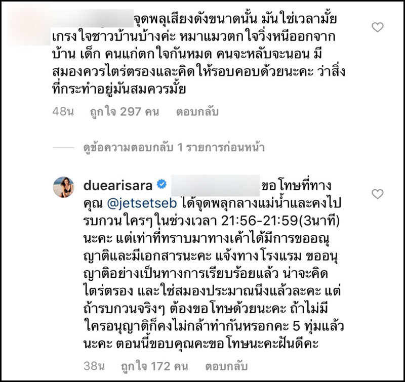 แต่งานนี้ ไม่วายเจอดราม่าจากชาวบ้านในระแวกที่เกิดตกใจเสียงพลุในช่วงเวลาพักผ่อน จนมีชาวบ้านในพื้นที่เข้าไปคอมเม้นท์ผ่านอินสตาแกรม ด้านสาวดิวก็เข้ามาตอบกลับแบบทันควันว่า “…ตนเองทราบว่ามีการขออนุญาตแล้ว ถ้าไม่มีใครอนุญาตก็คงไม่กล้าทำ..”