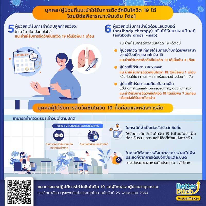 ราชวิทยาลัยอายุรแพทย์แห่งประเทศไทยสนับสนุนให้บุคคลทุกคนที่อายุตั้งแต่ 18 ปีขึ้นไปรับการฉีดวัคซีนโควิด 19 ที่ได้รับอนุญาตให้ใช้ในประเทศไทยในสถานการณ์ปัจจุบันโดยเร็วที่สุด รวมทั้งสนับสนุนให้ผู้ยังไม่เคยได้รับวัคซีนโควิด 19 ซึ่งมาตรวจติดตามรับการบริบาลที่สถานพยาบาลทั้งผู้ป่วยนอกและผู้ป่วยใน ได้รับวัคซีนโควิด 19ในวันที่มารับบริการหรือก่อนจำหน่ายกลับบ้าน