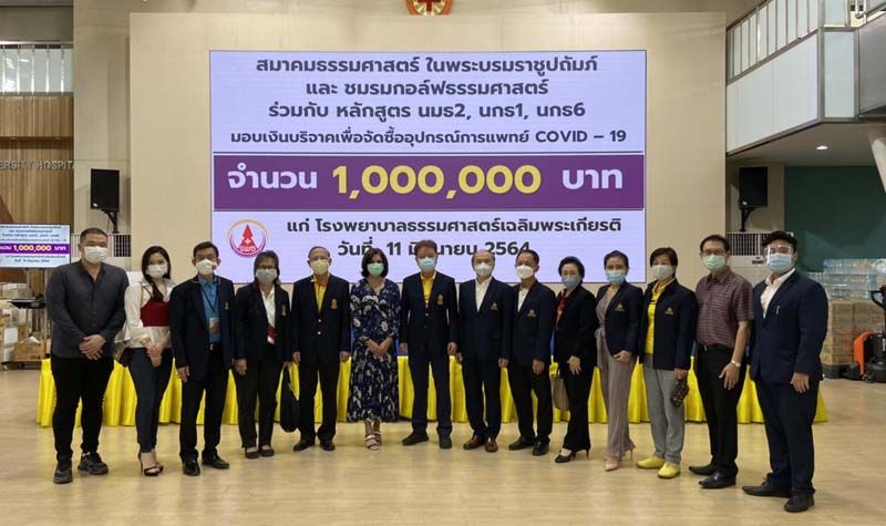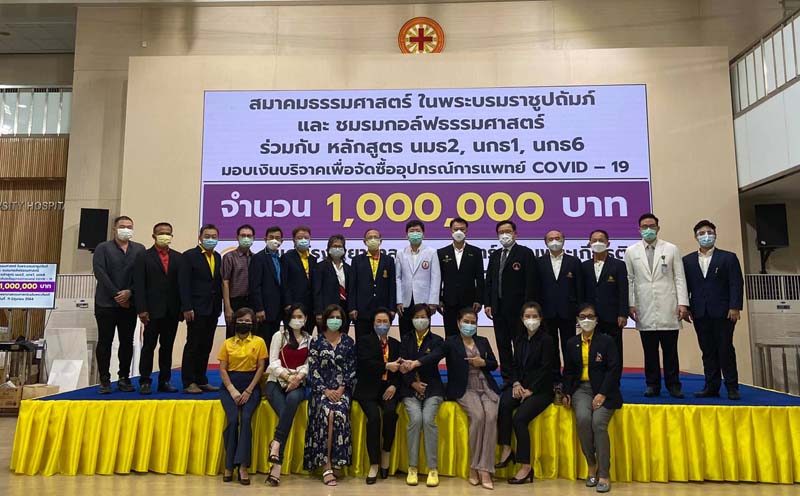 สมาคมธรรมศาสตร์ฯ-ชมรมกอล์ฟ ร่วมกับ หลักสูตร นมธ 2, นกธ 1, นกธ 6 มอบเงิน 1 ล้านบาท จัดซื้ออุปกรณ์การแพทย์ COVID-19 ให้ รพ.ธรรมศาสตร์เฉลิมพระเกียรติ