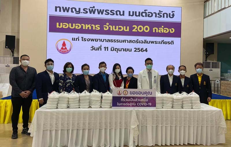 ศ.ดร.สุรพล นิติไกรพจน์ ประธานคณะกก.บริหาร รพ.ธรรมศาสตร์เฉลิมพระเกียรติ, รศ.นพ.พฤหัส ต่ออุดม ผอ.โรงพยาบาล, ผศ.นพ.ปรีดิ์ นิมมานนิตย์ ผช.ผอ.ฝ่ายวางแผนและงบประมาณ รับมอบเงินสนับสนุนจาก ดารณี วัธนเวคิน เลขาธิการสมาคมธรรมศาสตร์ฯ, หน้ากากอนามัย จาก บมจ. เอส เอ็น ซี ฟอร์เมอร์ และ อาหารกล่อง จาก ทพญ.รพีพรรณ มนต์อารักษ์