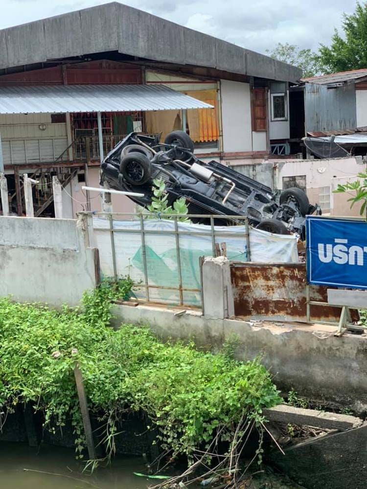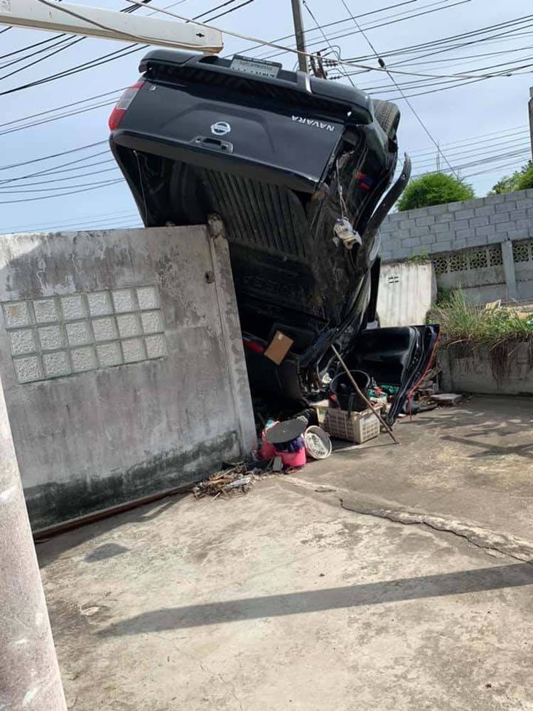 ขึ้นไปอยู่ได้ยังไง! รถกระบะพุ่งชนรั้วบ้าน คนขับหนีทิ้งรถไว้นานกว่า 1 เดือน