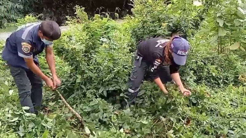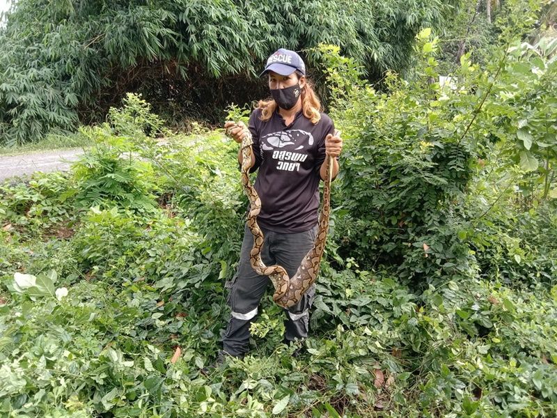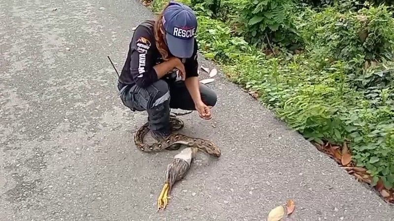 ทั้งนี้ ทางเจ้าหน้าที่กู้ภัยได้ทำการตรวจสอบในบริเวณป่าหน้าบ้านดังกล่าวพบงูเหลือมยาวประมาณ 2.50 เมตรแอบซุกตัวอยู่ในพงหญ้า ทางเจ้าหน้าที่กู้ภัยหญิงสาวจึงใช้มือจับบริเวณหัวงูเหลือม ส่วนเจ้าหน้าที่กู้ภัยชายใช้มือจับที่บริเวณด้านหางงูเหลือมไว้ และช่วยกันยกเจ้างูเหลือมมาวางไว้บนถนนพบว่าที่บริเวณท้องเจ้างูเหลือมป่องขนาดใหญ่ และเมื่อถูกจับตัวได้ ทางเจ้างูเหลือมจึงขย่อนคายหลักฐานเป็นไก่ชนหนุ่มออกมาจากท้อง จากนั้นเจ้าหน้าที่กู้ภัยได้มอบไก่ให้กับทางเจ้าของนำไปฝังดิน ส่วนงูเหลือมนำไปปล่อยคืนสู่ธรรมชาติ