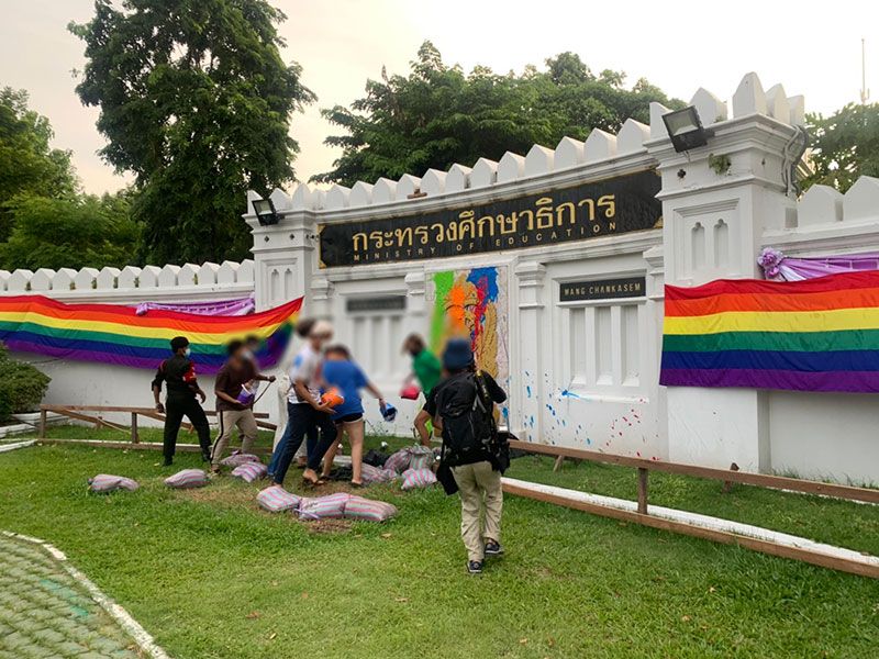 ผู้สื่อข่าวรายงานว่า ระหว่างนั้น มีพนักของ ศธ. ล้างคราบสี ที่กลุ่มนักเรียนได้ทำการลงสีลงตราเสมาธรรมจักร แต่ยังไม่ทันล้างเสร็จ ผู้ชุมนุมก็ทำการสาดสีที่ตราเสมาธรรมจักรซ้ำอีกครั้ง