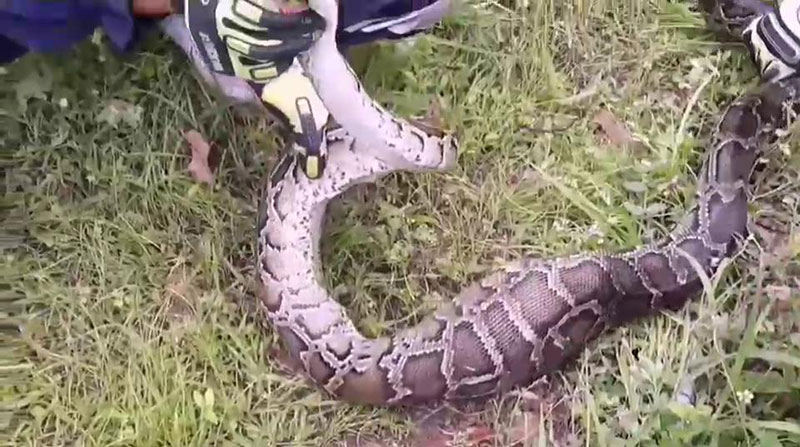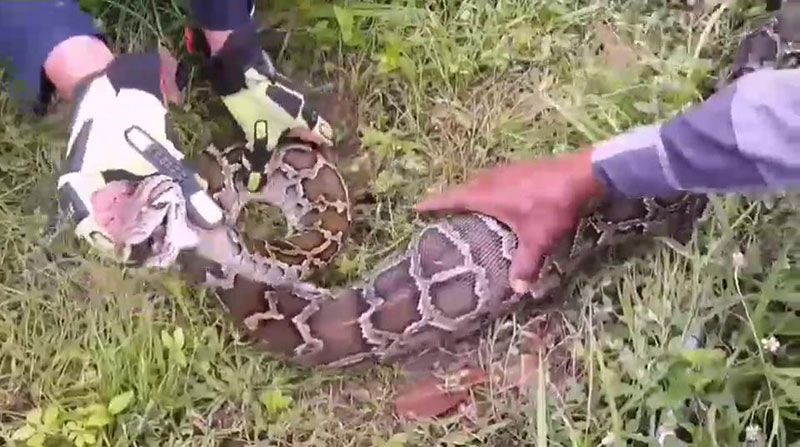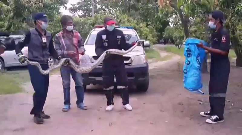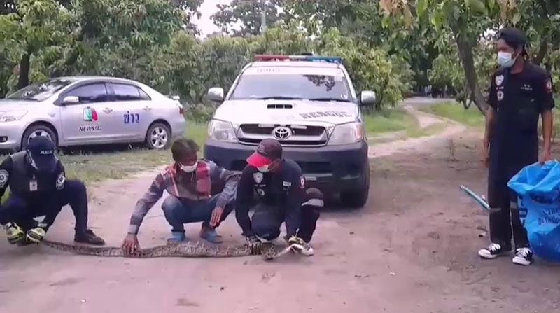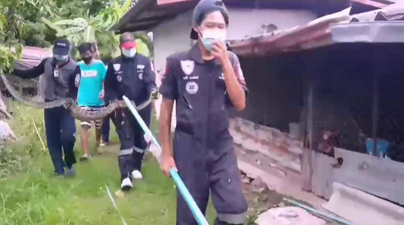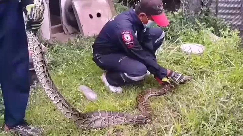หลังจากนั้นเจ้าหน้าที่กู้ภัยได้นำอุปกรณ์การจับงู ไปยังที่เกิดเหตุที่เล้าไก่ พบงูเหลือมขนาดใหญ่ ยาว 3 เมตร น้ำหนักอยู่ที่ 15 กิโลกรัม นอนพุงป่อง ไม่สามารถขยับตัวเลื้อยหนีได้ เจ้าหน้าที่กู้ภัยจึงได้ทำการใช้เชือกคล้องคองูเหลือม โดยจับได้อย่างรวดเร็ว ใช้เวลาการจับ 10 นาที ก่อนนำไปปล่อยคืนสู่ธรรมชาติต่อไป