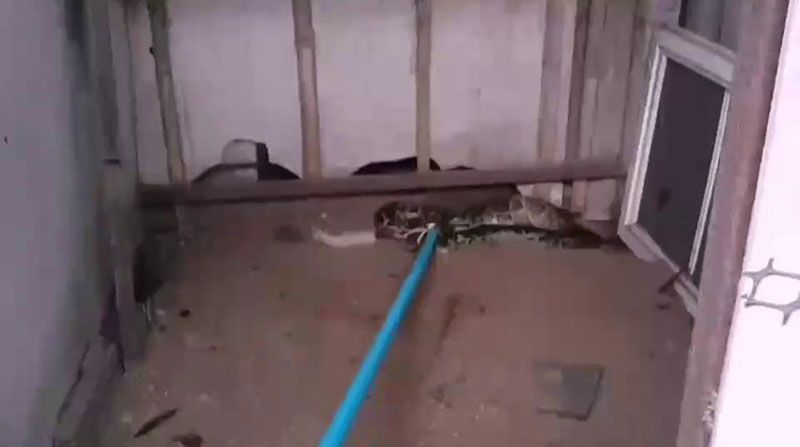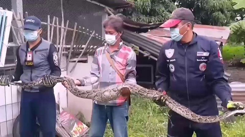 ล่าสุดตอนสายๆ ของวันนี้ตนเองได้มานั่งทำขนม ก็ได้ยินเสียงไก่ที่เล้ามันร้องดังผิดปกติ จึงได้เดินไปดูให้เห็นกับตาว่าเป็นตัวอะไรกันแน่ ที่มากินไก่กับแมวของตนเอง ทันทีนั้นตนเองได้เปิดเล้าไก่เข้าไปดู เห็นอะไรตัวดำๆคล้ายงูเหลือมขนาดใหญ่นอนนิ่งขดตัวอยู่ในเล้าไก่ ตนแทบช็อกได้ตะโกนเรียกหลานที่บ้านให้มาช่วยดู ว่าที่เห็นมันใช่งูเหลือมหรือไม่ เพราะสายตาตนเองมองไม่ค่อยชัดเนื่องจากอายุมากแล้ว หลังจากนั้นจึงได้ทำการแจ้งเจ้าหน้าที่กู้ภัยให้มาจับงูที่บ้านของตนเองดังกล่าว