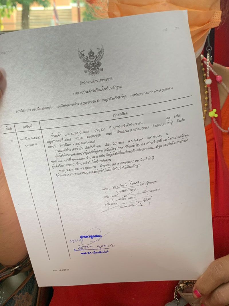 และในวันนี้ในช่วงเวลา 07.00 น. ได้ไปลงบันทึกประจำวันที่ สถานีตำรวจภูธรเมืองสิงห์บุรี โดยนางสมพรกล่าวว่า รู้ตัวว่าตัวเองถูกรางวัลที่ 1 เมื่อเช้ามืดของวันนี้ ขณะที่เตรียมปลาทับทิมลงขาย ได้ยถามสามีว่าตนซื้อล็อตเตอรี่เลขท้าย 861 ไว้ แล้วเลขข้างหน้าออกอะไร เมื่อสามีบอกว่า 691861 จึงได้ทราบว่าถูกรางวัลที่ 1 ในงวดประจำวันที่ 16 มิ.ย.นี้แล้วจำนวน 2 ใบ ด้วยความดีใจจึงได้แจกปลาทับทิมยกแผงจำนวน 200 กก. หมดเลย