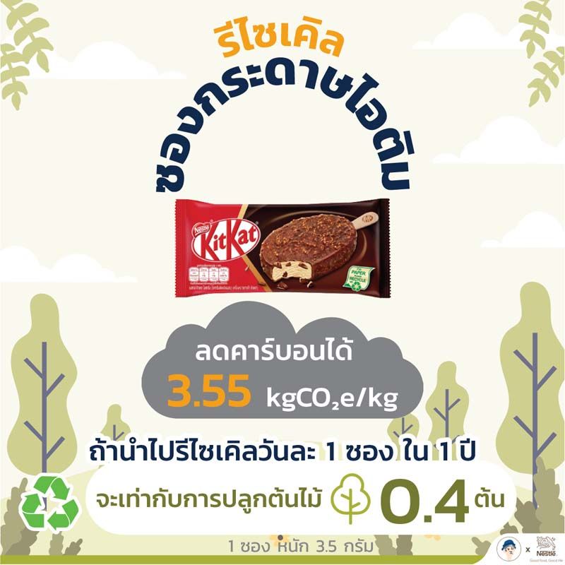 รีไซเคิลสิ่งนี้ ดีต่อโลกแค่ไหน ขวด PET-การรีไซเคิลขวดน้ำดื่มเนสท์เล่เพียวไลฟ์ ลดคาร์บอนได้ 1.04 กก.CO2e ต่อหนึ่ง กก. หากนำไปรีไซเคิลเพียงวันละ 1 ขวด ใน 1 ปีจะเทียบเท่าการปลูกต้นไม้ 0.7 ต้น, กระป๋องอะลูมิเนียม-ช่วยลดคาร์บอนไป 9.13 กก. CO2e ต่อหนึ่ง กก. นำไปรีไซเคิลเพียงวันละ 1 กระป๋องใน 1 ปีจะเทียบเท่าการปลูกต้นไม้ 3.3 ต้น, ซองกระดาษไอศกรีม-ลดคาร์บอนไป 3.55 กก. CO2e ต่อหนึ่ง กก. นำไปรีไซเคิลเพียงวันละ 1 ซอง ใน 1 ปีจะเทียบเท่าการปลูกต้นไม้ 0.4 ต้น, กล่อง UHT-ลดคาร์บอนไป 4.08 กก. CO2e ต่อหนึ่ง กก. นำไปรีไซเคิลเพียงวันละ 1 กล่องใน 1 ปีจะเทียบเท่าการปลูกต้นไม้2.2 ต้น, ขวดแก้ว-ลดคาร์บอนได้ 0.28 กก. CO2eต่อหนึ่ง กก. นำไปรีไซเคิลเพียงวันละ 1 ขวด ใน 1 ปีจะเทียบเท่าการปลูต้นไม้1.7 ต้น, กล่องลังกระดาษ-ลดคาร์บอนได้ 3.14 กก. CO2e ต่อหนึ่ง กก. นำไปรีไซเคิลเพียงวันละ 1 ลัง ใน 1 ปีจะเทียบเท่าการปลูกต้นไม้ 11.4 ต้น