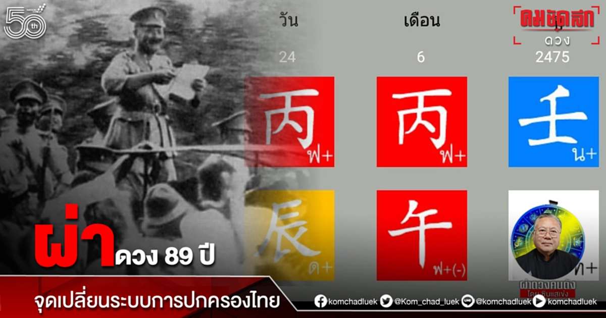“ซินแสเข่ง” ผ่าดวงวิฤกติวิเคราะห์ 89 ปี จุดเปลี่ยนระบบการปกครองของไทย “ตู่ จตุพร” ประกาศกร้าว 24 มิ.ย. นี้ เชิญชวนขับไล่รัฐบาล ชี้ วันเดือนเหมือนกัน แต่ต่างปี ราศีไม่ปะทะกลุ่มก่อความไม่สงบไม่ประสบความสำเร็จ ผลร้ายเข้าตัวเองเพราะตกดวงทำลาย