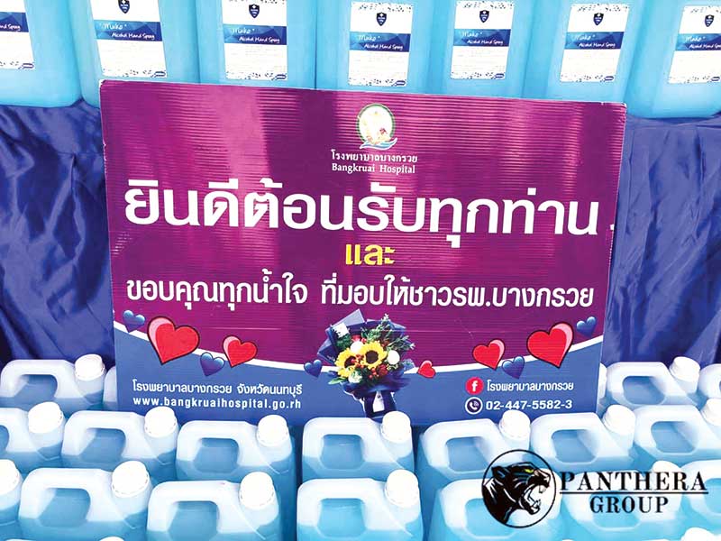 หลังจากที่ได้บริจาคชุดป้องกันส่วนบุคคลให้กับโรงพยาบาลและโรงพยาบาลสนามจำนวน 6 แห่งทั่วกรุงเทพฯไปแล้วกว่า 2,000 ชุด กลุ่มบริษัทแพนเธราก็ได้สอบถามกับทางโรงพยาบาลต่างๆ เพิ่มเติมว่าทางโรงพยาบาลต้องการแอลกอฮอล์เป็นจำนวนกี่ลิตร ซึ่งคำตอบที่ทางเราได้รับกลับมาคือ 5,000 ลิตร