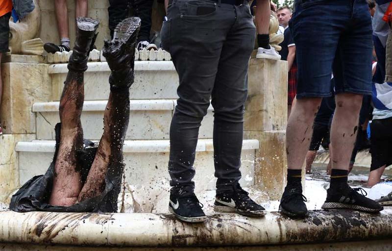เมาหัวทิ่ม : แฟนบอล “ตาร์ตัน อาร์มี่” ทีมชาติสกอตแลนด์ ทำตัวสมชื่อแฟนบอลทีมขี้เมาแดนสกอตต์ ระหว่างรวมตัวแสดงแสนยานุภาพบริเวณจัตุรัสเลสเตอร์ สแควร์ ในกรุงลอนดอน ของอังกฤษ ก่อนทีมชาติสกอตแลนด์จะลงฟาดแข้งกับทีมชาติอังกฤษ ในรอบแบ่งกลุ่มฟุตบอลชิงแชมป์แห่งชาติยุโรป ยูโร 2020