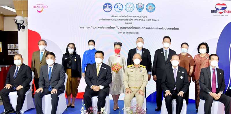 นายพิพัฒน์ รัชกิจประการ รัฐมนตรีว่าการกระทรวงการท่องเที่ยวและกีฬา เป็นประธานในพิธีลงนามบันทึกข้อตกลงความร่วมมือว่าด้วยการสนับสนุนและขับเคลื่อนโครงการ “ฮักไทย(HUG THAIS)” รวมใจ ไทยไม่ทิ้งกันระหว่างการท่องเที่ยวแห่งประเทศไทย (ททท.) หอการค้าไทย และสภาหอการค้าแห่งประเทศไทย และเผยว่า เนื่องจากสถานการณ์การแพร่ระบาดของโควิด-19 ส่งผลให้ผู้ประกอบการท่องเที่ยวไทยได้รับผลกระทบอย่างหนัก ทยอยปิดตัวลงมีผู้ตกงานและรายได้ลดลงกว่า 80-90% จึงได้กำหนดนโยบายเพื่อแก้ปัญหา อาทิมาตรการเยียวยา แนวทางจัดสรรวัคซีนให้กับประชาชนทั่วไปในจังหวัดที่จะทำการต้อนรับนักท่องเที่ยว ต้องได้รับการฉีดวัคซีน 70% ของประชากรทั้งหมดและผู้ประกอบการท่องเที่ยวจะต้องได้รับวัคซีนแล้ว 100% เพื่อสร้างความมั่นใจให้กับทุกคน รวมถึงการเปิดรับนักท่องเที่ยวชาวต่างชาติตามนโยบายการเปิดประเทศ (Phuket Sandbox) ในวันที่ 1 กรกฎาคม 2564 ซึ่งอนุญาตให้นักท่องเที่ยวได้รับวัคซีนครบแล้วสามารถเข้าประเทศไทยได้โดยไม่ต้องกักตัว 14 วัน แต่ต้องพำนักในที่พักหรือโรงแรมที่ได้รับรองเครื่องหมาย SHA+ (SHA Plus) หรือสัญลักษณ์มาตรฐานท่องเที่ยวปลอดภัยด้านสุขอนามัยโดย ททท. และ สธ. เพื่อยืนยันมาตรการด้านความปลอดภัย