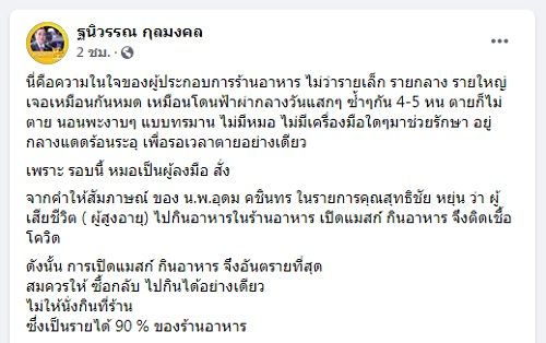 27 มิถุนายน 2564 นางฐนิวรรณ กุลมงคล นายกสมาคมภัตตาคารไทย เปิดเผยความในใจผ่านเฟซบุ๊ก “ฐนิวรรณ กุลมงคล” หลังจากเว็บไซต์ราชกิจจานุเบกษา เผยแพร่ข้อกำหนดออกมาควบคุมการติดเชื้อโควิด-19 โดยให้การจำหน่ายอาหารหรือเครื่องดื่ม ร้านจำหน่ายอาหารหรือเครื่องดื่ม ให้เปิดดำเนินการเฉพาะการนำกลับไปบริโภคที่อื่นเท่านั้นเป็นเวลา 30 วัน ระบุว่า…