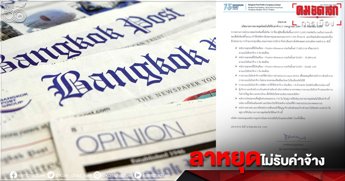 รายงานว่าเมื่อวันที่ 28 มิ.ย.บริษัท บางกอกโพสต์ จำกัด(มหาชน)เจ้าของหนังสือพิมพ์ BANGKOK POST, เว็บไซต์ posttodayและนิตยสารอีกหลายฉบับเช่น Forbes Thailand และ Elle Thailand เป็นต้น ประกาศนโยบายการลาหยุดโดยไม่รับค่าจ้าง(Leave Without Pay)ตั้งแต่วันที่ 1 ก.ค.-30 ก.ย.2564 เนื่องจากสถานการณ์การแพร่ระบาดโควิด-19 และภาวะตกต่ำของสื่อสิ่งพิมพ์ทั้งระบบทำให้บริษัทมีผลขาดทุนต่อเนื่องประมาณ 15 ล้านบาทต่อเดือนขณะที่ปัจจุบันบริษัทมีผลขาดทุนสะสมกว่า 1,500 ล้านบาท