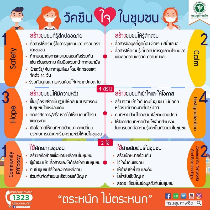 พร้อมทั้งมองหาโอกาสในการแก้ไขปัญหาต่างๆ ไปได้ วัคซีนใจในระดับครอบครัว มุ่งเน้นให้สมาชิกในครอบครัวมีพลังฟันฝ่าวิกฤตไปด้วยกัน ด้วย “3 พลัง” ได้แก่ พลังบวก พลังยืดหยุ่น และพลังร่วมมือ ขณะที่วัคซีนใจในระดับชุมชน ถือเป็นมาตรการสำคัญที่ส่งเสริมให้คนในชุมชนดูแลช่วยเหลือซึ่งกันและกันผ่านหลักการ “4 สร้าง 2 ใช้” คือการใช้ศักยภาพที่มีในชุมชน ร่วมกับใช้สายสัมพันธ์ที่ดีของสมาชิกในชุมชน มาร่วมกันสร้างให้เกิดความรู้สึกปลอดภัย รู้สึกสงบ รู้สึกมีความหวัง เข้าใจและให้โอกาสกันและกัน