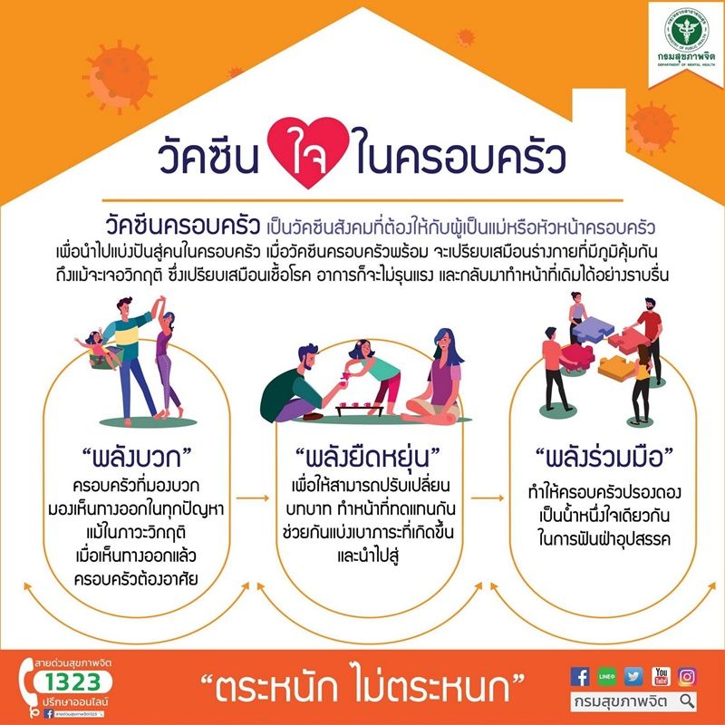 กรมสุขภาพจิตฯ แนะใช้วัคซีนใจสู้ภัยโควิด-19 สร้างภูมิคุ้มกันระดับบุคคล ครอบครัว และชุมชน พร้อมหลัก “อึด ฮึด สู้” เพื่อให้ประชาชนมีกำลังใจที่เพียงพอในการเผชิญปัญหา