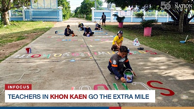 After studying online for so many months, students may find it difficult to pay attention in class now that schools have reopened. So, teachers at Khon Kaen’s Sok Ten Wittayakhom Primary School have made an extra effort by decorating the road to school with quick language and maths lessons.