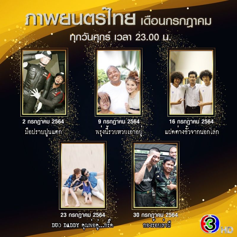 เพื่อความบันเทิงอย่างไม่สิ้นสุดทุกวันศุกร์ในเดือนกรกฎาคมเวลา 23.00-00.30 น.ช่อง 3 ขอนำภาพยนตร์ไทยน้ำดีมาเรียกเสียงฮา โดยเริ่มตั้งแต่วันศุกร์ที่ 2 ไปจนถึงวันศุกร์สุดท้าย 30 กรกฎาคม2564 ถึง5 เรื่อง 5 รสเริ่มตั้งแต่ “มือปราบปูนแตก”เรื่องราวความฮาของไอ้เปี๊ยก หนุ่มดวงตกที่ต้องออกจากงานและเมียยังมาท้องป่อง ต่อด้วยเรื่อง “พรุ่งนี้รวยหวยเอาอยู่” เรื่องราวป่วน ๆ ของสองพ่อลูกคู่ซี้ที่มีลอตเตอรี่เป็นเหตุ หลังจากนั้นตามมาด้วยเรื่อง“แฝดต่างขั้วจากนอกโลก”เมื่อความลับของแฝดต่างขั้วกำลังจะถูกเปิดเผย พวกเขาจะทำอย่างไรส่วนศุกร์ที่ 4 ของเดือนมาสนุกต่อกับเรื่อง “DUO DADDY คุณพ่อคู่…กรี๊ด”เรื่องราวของสองศิลปินคู่หูดูโอ นามว่า “Duo Toys” ที่อยากกลับมาดังต้องทำวิธีไหนดีและปิดที่ศุกร์สุดท้ายมาสยองกับ “กองร้อยล่าผี”เมื่อค่ายทหารแห่งหนึ่งที่ร่ำลือกันว่ามีเรื่องราวลี้ลับซ่อนอยู่ บรรดาพลทหารใหม่จะทำอย่างไร