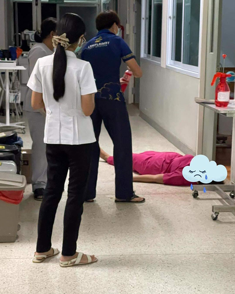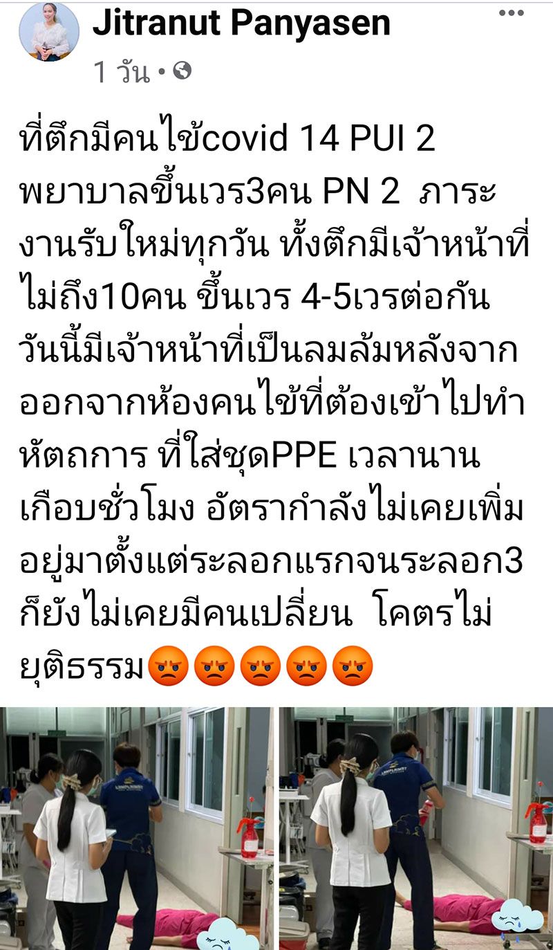 2 กรกฎาคม 2564 โลกออนไลน์ผู้ใช้เฟสบุ๊กคนหนึ่งโพสต์ภาพขณะผู้ช่วยพยาบาล โรงพยาบาลแห่งหนึ่ง นอนเป็นลมอยู่หน้าห้องผู้ป่วยโควิด พร้อมระบุข้อความว่า “ตึกมีคนไข้covid 14 PUI 2 พยาบาลขึ้นเวร 3 คน PN 2 ภาระงานรับใหม่ทุกวัน ทั้งตึกมีเจ้าหน้าที่ไม่ถึง 10 คน ขึ้นเวร 4-5 เวรต่อกัน วันนี้มีเจ้าหน้าที่เป็นลมล้มหลังจากออกจากห้องคนไข้ที่ต้องเข้าไปทำหัตถการ ที่ใส่ชุด PPE เวลานาน เกือบชั่วโมง อัตรากำลังไม่เคยเพิ่ม อยู่มาตั้งแต่ระลอกแรกจนระลอก 3 ก็ยังไม่เคยมีคนเปลี่ยนโคตรไม่ยุติธรรม” จนชาวโซเชียลเข้าไปแสดงความคิดเห็น ส่วนใหญ่ก็ให้กำลังใจ ขณะที่บางคนก็ฝากถึงต้นสังกัดให้ดูแลจัดสรรบุคลากรให้เพียงพอ