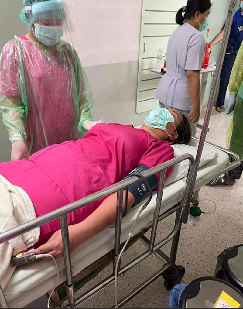 ส่วนกรณีที่ปรากฎในโลกโซเชียลที่มีผู้ช่วยพยาบาลเป็นลม เนื่องจากช่วงหลังๆ มีผู้ป่วยเข้ามาตลอด ทั้งผู้ป่วยที่ยืนยันและที่มีอาการใกล้เคียง ทำให้เจ้าหน้าที่แทบไม่ได้พักก็จะมีอาการเหนื่อยล้า ซึ่งวันเกิดเหตุผู้ช่วยพยาบาลคนดังกล่าวก็ปฏิบัติหน้าที่ดูแลผู้ป่วยโควิด เคสที่มียาย ลูกสาว และหลานติดเชื้อโควิด แต่วันนั้นยายอาการไม่ค่อยดีจึงจะแยกหลานออกไปไว้กับแม่ แต่ด้วยความที่เด็กเห็น จนท.ใส่ชุดพีพีอีก็เลยเกิดความกลัวเด็กก็เลยดิ้นร้องไห้ จนท.ก็ต้องช่วยกันเกลี้ยกล่อมเพื่อแยกเด็กมาอยู่กับแม่ เพื่อจะได้ดูแลยายได้อย่างเต็มที่ ทำให้จนท.ซึ่งรวมถึงผู้ช่วยพยาบาลคนดังกล่าว ต้องสวมใส่ชุดพีพีอีอยู่ตรงนั้นเป็นเวลานานถึง 45 นาที ทำให้ผู้ช่วยพยาบาลเกิดอาการเหนื่อยล้าเป็นลม
