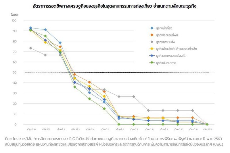 รวมทั้งข้อมูลปฐมภูมิจากการสัมภาษณ์ผู้ประกอบการและแรงงานในอุตสาหกรรมการท่องเที่ยว พบว่ารายได้จากนักท่องเที่ยวต่างชาติจะลดลงประมาณ 4.4 แสนล้านบาท จากปี 2563 จังหวัดที่ได้รับผลกระทบมากที่สุด คือ ภูเก็ต กรุงเทพฯ และชลบุรี ซึ่งมีสัดส่วนของนักท่องเที่ยวต่างชาติมากที่สุด ธุรกิจที่ได้รับผลกระทบ คือ ธุรกิจนันทนาการ ธุรกิจนำเที่ยว ธุรกิจอาหารและเครื่องดื่ม ธุรกิจจำหน่ายสินค้าและของที่ระลึก ธุรกิจโรงแรมที่พักและธุรกิจขนส่งตามลำดับ