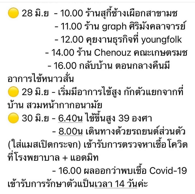 เนื่องจากในวันที่ 26 – 28 มิถุนายนที่ผ่านมาพิมได้มีการเดินทางกลับมาที่เชียงใหม่ด้วยสายการบิน Thai smile WE 102 เพื่อเยี่ยมครอบครัวและติดต่อธุรกิจส่วนตัว โดยตลอดระยะเวลาที่พักอาศัยอยู่ที่กรุงเทพ พยายามดูแลตัวเองอย่างดีและหลีกเลี่ยงการไปในพื้นที่เสี่ยง และได้มีการเข้าตรวจหาเชื้อ Covid-19 เรื่อยๆเพื่อเป็นการตรวจเช็คก่อนการทำงาน หลังจากนั้นได้มีการออกไปทำงานในช่วงวันที่ 21 และกลับเข้ามาอยู่ในที่พักจนถึงวันเดินทาง (26 มิถุนายน) และในคืนวันที่ 28 มิถุนา เริ่มมีอาการไข้ต่ำๆ วันที่ 29 จึงกักตัวแยกจากครอบครัวอยู่ที่บ้าน เช้าวันที่ 30 ยังคงมีไข้สูง จึงเข้ารับการตรวจหาเชื้อ โควิดผลแลปได้แจ้งว่า พบเชื้อ Covid -19 และได้เข้าแอดมิทที่โรงพยาบาลในจังหวัดเชียงใหม่ค่ะ
