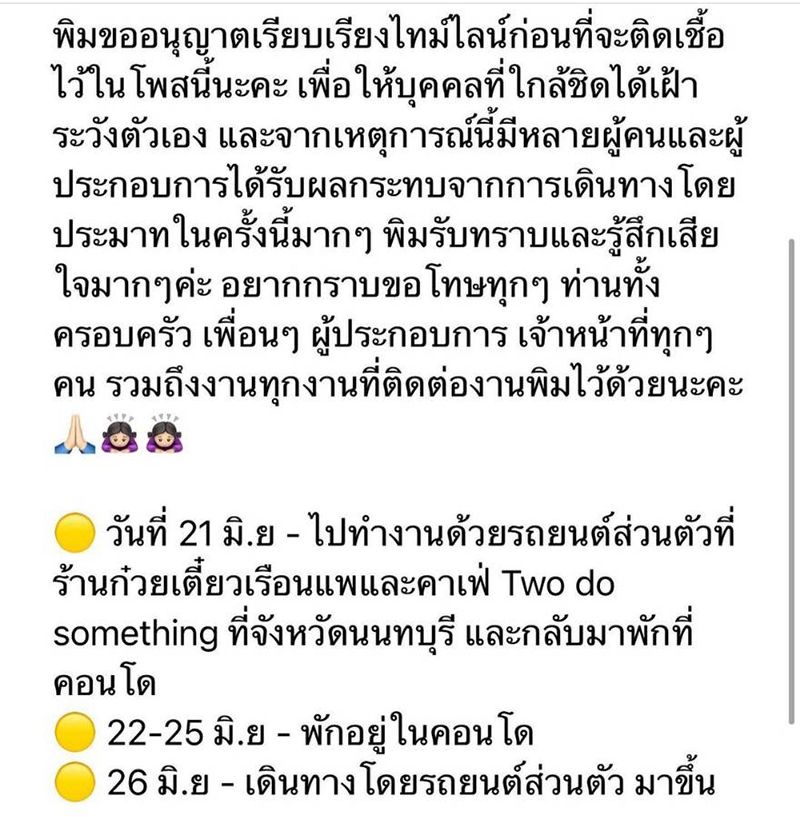 พิมขออนุญาตเรียบเรียงไทม์ไลน์ก่อนที่จะติดเชื้อไว้ในโพสนี้นะคะ เพื่อให้บุคคลที่ใกล้ชิดได้เฝ้าระวังตัวเอง และจากเหตุการณ์นี้มีหลายผู้คนและผู้ประกอบการได้รับผลกระทบจากการเดินทางโดยประมาทในครั้งนี้มากๆ พิมรับทราบและรู้สึกเสียใจมากๆค่ะ อยากกราบขอโทษทุกๆ ท่านทั้งครอบครัว เพื่อนๆ ผู้ประกอบการ เจ้าหน้าที่ทุกๆคน รวมถึงงานทุกงานที่ติดต่องานพิมไว้ด้วยนะคะ