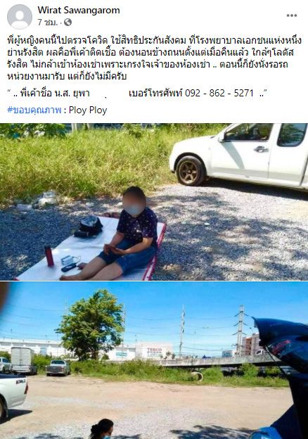 โดยเจ้าของโพสต์ระบุว่า “พี่ผู้หญิงคนนี้ไปตรวจโควิด ใช้สิทธิประกันสังคม ที่โรงพยาบาลเอกชนแห่งหนึ่งย่านรังสิต ผลคือพี่เค้าติดเชื้อ ต้องนอนข้างถนนตั้งแต่เมื่อคืนแล้ว ใกล้ๆโลตัสรังสิต ไม่กล้าเข้าห้องเช่าเพราะเกรงใจเจ้าของห้องเช่า .. ตอนนี้ก็ยังนั่งรอรถหน่วยงานมารับ แต่ก็ยังไม่มีครับ“..พี่เค้าชื่อ น.ส. ยุพา เบอร์โทรศัพท์ 092 – 862 – 5271 ..”