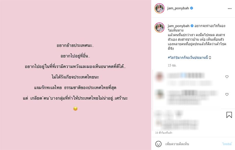 “อยากย้ายประเทศนะ อยากไปอยู่ที่อื่น.. อยากไปอยู่ในที่ที่เรามีความหวังและมองเห็นอนาคตที่ดีได้ ไม่ได้รังเกียจประเทศไทยนะ แจมรักทะเลไทย ธรรมชาติของประเทศไทยที่สุด แต่ เกลียด “คน” บางกลุ่มที่ทำให้ประเทศไทยไม่น่าอยู่ เศร้านะ”
