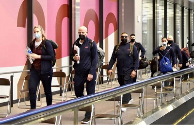 Airport liaison officials — a group sent from the Tokyo Games organizing committee to guide overseas teams and confirm whether anyone tested positive — met and boarded the plane. After the general passengers had disembarked, the officials ushered the U.S. team to the virus testing area via a special lane. On the same day, the 40-member German rowing team arrived at Haneda Airport.