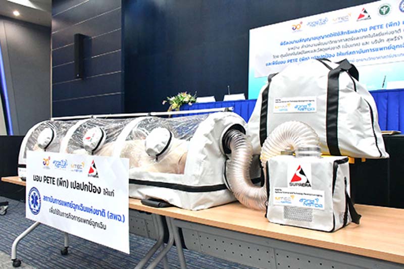 ประเทศไทยของเราก็เช่นกัน ซึ่งเมื่อวันที่ 30 มิถุนายน 2564 ที่ผ่านมา ที่ห้องประชุม 601 อาคารสราญวิทย์ อุทยานวิทยาศาสตร์ประเทศไทย จ.ปทุมธานี กระทรวงการอุดมศึกษา วิทยาศาสตร์ วิจัยและนวัตกรรม (อว.) โดยศูนย์เทคโนโลยีโลหะและวัสดุแห่งชาติ (เอ็มเทค) สำนักงานพัฒนาวิทยาศาสตร์และเทคโนโลยีแห่งชาติ (สวทช.) จัดพิธีลงนามสัญญาอนุญาตให้ใช้สิทธิผลงาน PETE (พีท) เปลปกป้องหรือ “เปลความดันลบเคลื่อนย้ายผู้ป่วยโควิด-19” แบบออนไลน์ ระหว่าง เอ็มเทค สวทช. กับ บริษัท สุพรีร่า อินโนเวชั่นจำกัด พร้อมได้มอบเปลความดันลบ ให้แก่สถาบันการแพทย์ฉุกเฉินแห่งชาติ (สพฉ.) เพื่อใช้ในภารกิจการแพทย์ฉุกเฉิน