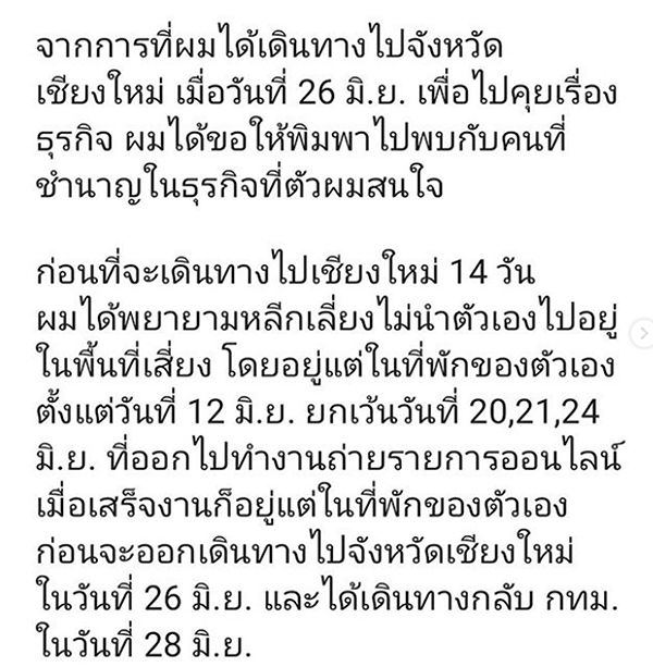 โดยอยู่แต่ในที่พักของตัวเองตั้งแต่วันที่ 12 มิ.ย. ยกเว้นวันที่ 20,21,24 มิ.ย. ที่ออกไปทำงานถ่ายรายการออนไลน์เมื่อเสร็จงานก็อยู่แต่ในที่พักของตัวเองก่อนจะออกเดินทางไปจังหวัดเชียงใหม่ในวันที่ 26 มิ.ย. และได้เดินทางกลับกทม.ในวันที่ 28 มิ.ย.