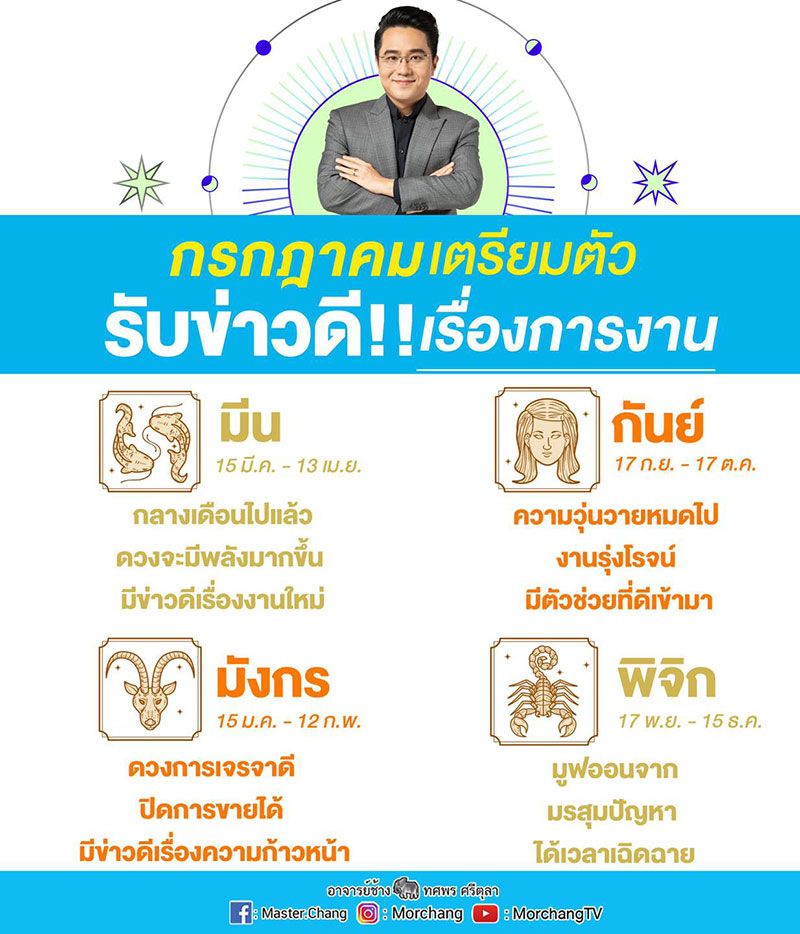 ทั้งนี้ “หมอช้าง” ระบุว่า สำหรับในเดือนนี้จะมี 4 ราศีที่เตรียมตัวรับข่าวดีเรื่องการงาน ประกอบด้วย