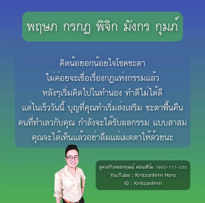 วันที่ 6 กรกฎาคม 2564 หมอกฤษณ์ คอนเฟิร์ม โพสต์เพจเฟซบุ๊ก “หมอกฤษณ์ คอนเฟิร์ม ดูดวงฟรีแก่ทุกท่าน” เผย 5 ราศี ดังนี้ พฤษภ กรกฎ พิจิก มังกร และกุมภ์ คิดน้อยอกน้อยใจโชคชะตา ไม่ค่อยเชื่อเรื่องกฎแห่งกรรมแล้ว