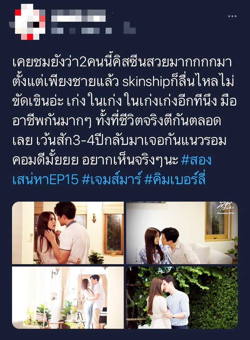 ฟากสาว “คิมเบอร์ลี่” เผยว่า “ก่อนอื่นก็ดีใจที่มีแฟนคลับบ้าน JK ที่น่ารักและติดตามกันมาจนถึงทุกวันนี้ ถึงแม้ว่า คิมกับ เจมส์ มาร์ จะห่างหายเล่นคู่กันมาก็หลายปีแล้ว แต่แฟนๆก็ยังเหนียวแน่นกันมาตลอดยังคอยซัพพอร์ตเรามาตลอดก็รู้สึกดีใจมากๆ และขอขอบคุณทุกคำชมเลย ดีใจมากที่มีคนชมว่าเราแสดงได้ดี เพราะว่าเราก็ทำการบ้านกับมันเต็มที่ที่สุดเท่าที่เราจะทำได้แล้ว และพอได้รับคำชมก็รู้สึกฟินค่ะ ก็ฝากละคร สองเสน่หา ตอนนี้ก็เข้าสู่โค้งสุดท้ายแล้วรับรองว่าจะเข้มข้นขึ้นไปอีกแน่นอน” ใครที่กำลังตั้งตารอลุ้นบทสรุป “สองเสน่หา” ห้ามพลาดเด็ดขาด ในวันพุธที่7 กรกฎาคม 2564 เวลา 20.30 น. เสนอเป็นตอนจบ และรอติดตามละครที่มารับช่วงต่ออย่าง “ให้รักพิพากษา”เริ่มตอนแรกวันพฤหัสบดีที่ 8 กรกฎาคม 2564 นี้ ทางช่อง 3 กด 33 หรือติดตามความเคลื่อนไหวได้ที่ CH3Thailand และแอปพลิเคชั่น CH3 Plus